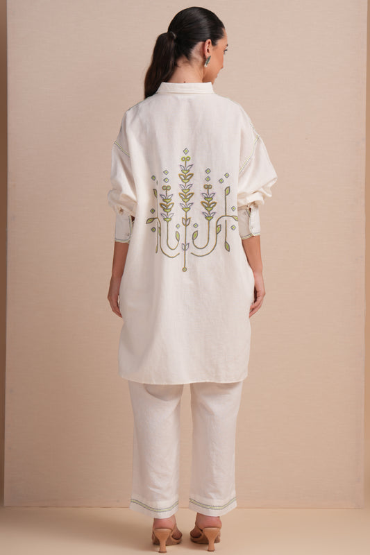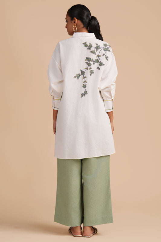 Linen High/Low Sap Green Embroidery Shirt Set