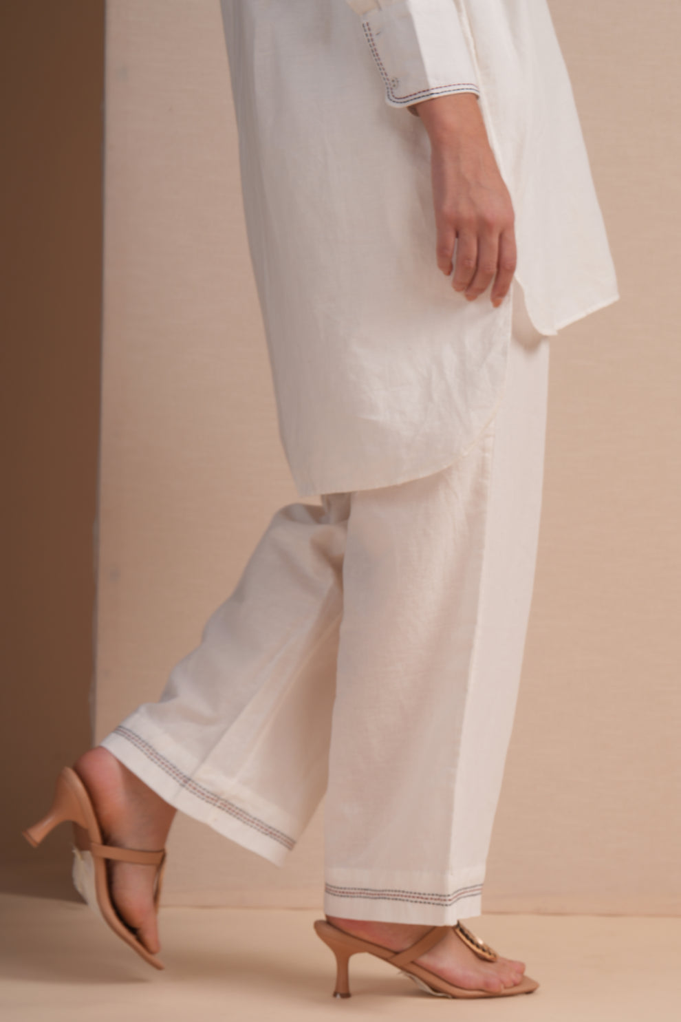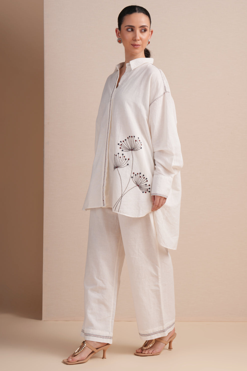 Linen High/Low Maroon & Navy Embroidery Shirt Set